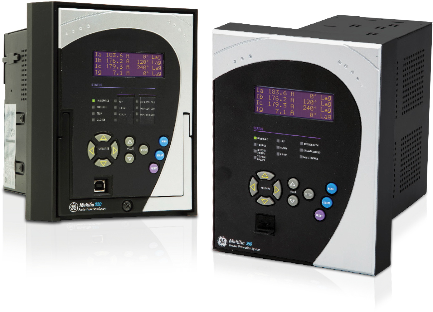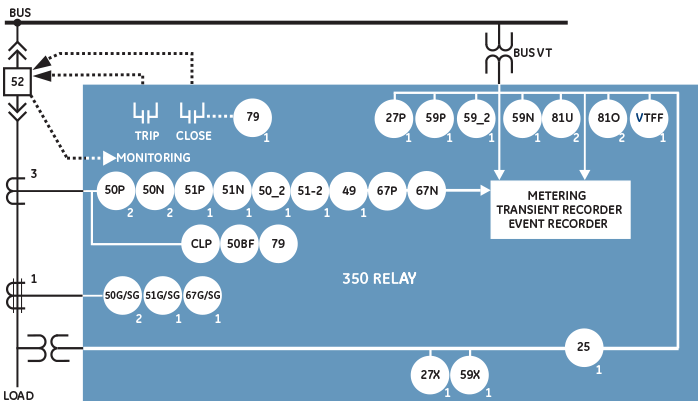 Le 350 est utilisé pour effectuer la protection primaire ou de sauvegarde des départs de moyenne et haute tension ainsi que pour les artères. Le groupe de fonctions de protection de base de ce relais comprend plusieurs éléments de surintensités instantanées ou temporisées pour la coordination entre les dispositifs en amont et en aval. En outre, le 350 offre de fonctions de contrôle de disjoncteurs tels que le blocage de courant d'appel, la défaillance de disjoncteur, le synchronisme et le réenclenchement automatique. |